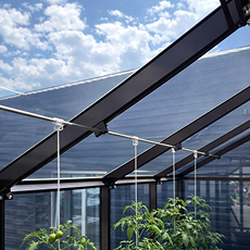 - Прутковая нержавеющая система подвязывания. Равномерно распределяет нагрузку на крышу, предотвращается локальное давление на стекло и упрощается уход за высокорослыми культурами.